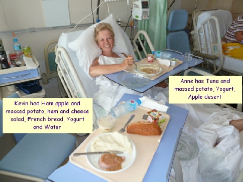 They fed Kevin a large tender steak, peas, French bread (can the French make bread?) water and an orange. Anne got the mushed version, mince, and pea potato mix, bread but she gets desert, Jelly, apple puree and a yogurt. I did finely cut up some of the steak for her which she enjoyed.